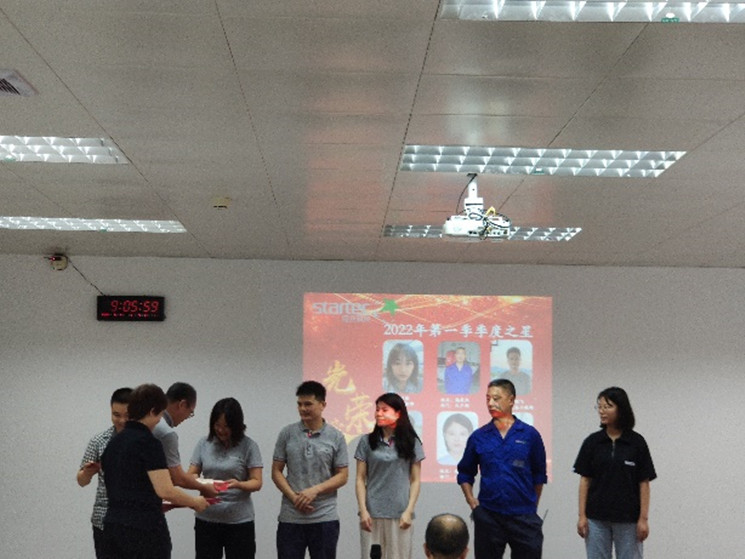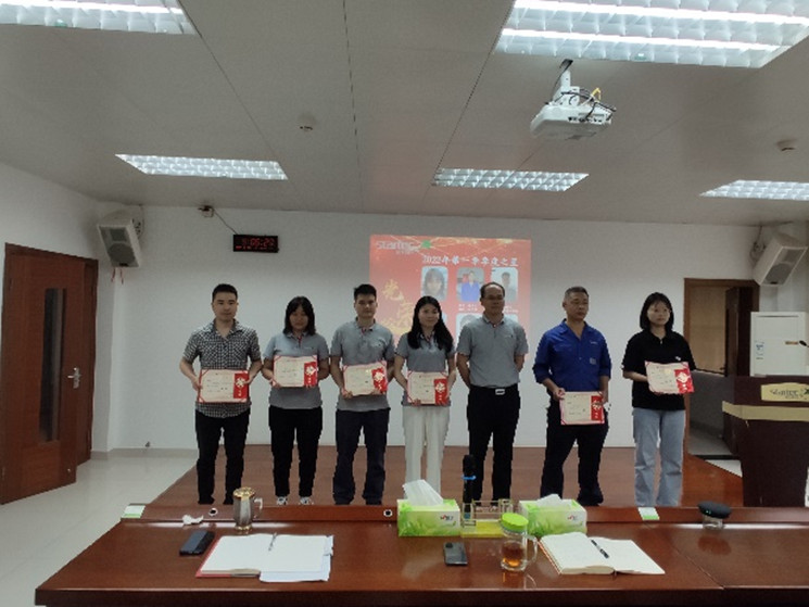 会议开始环节是季度之星颁奖活动,公司常务副总袁总为2022年第一季度的季度之星颁发了奖金和证书。季度之星按研发、生产、销售、职能四个系统进行评比,本季度获奖人员有生产部魏成汉、物控部刘涯、设备工程部陆明飞、销售部陈序欢、研究院分析检测组谢佩佩、体系管理中心罗青溶。体系管理中心罗青溶作为代表进行发言,袁总在随后的讲话中肯定了季度之星的工作表现,同时也期望季度之星起表率作用,带动更多的人成为季度之星。